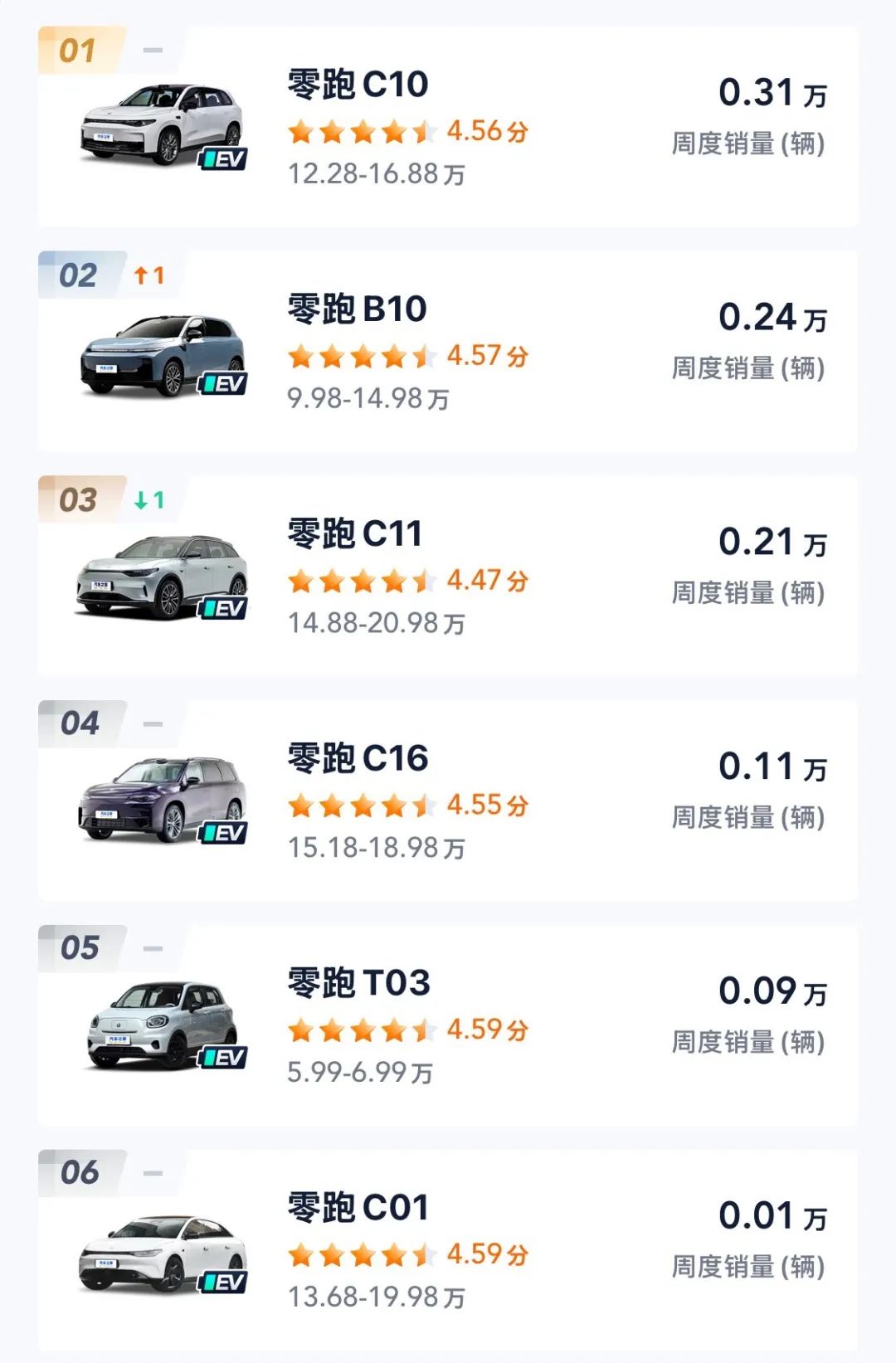 零跑汽车单周销量0.97万辆,零跑汽车在售车型包括T03、C01、C10、C11、C16、B10,其中零跑C10为0.31万辆,零跑B10为0.24万辆,零跑C11为0.21万辆,零跑C16为0.11万辆。据了解,全新车型零跑B01将于6月预售,7月上市,新车基于原生后驱(LEAP3.5技术)架构打造,其后驱电机最大功率分别为132kW和160kW,CLTC纯电续航里程为650km。