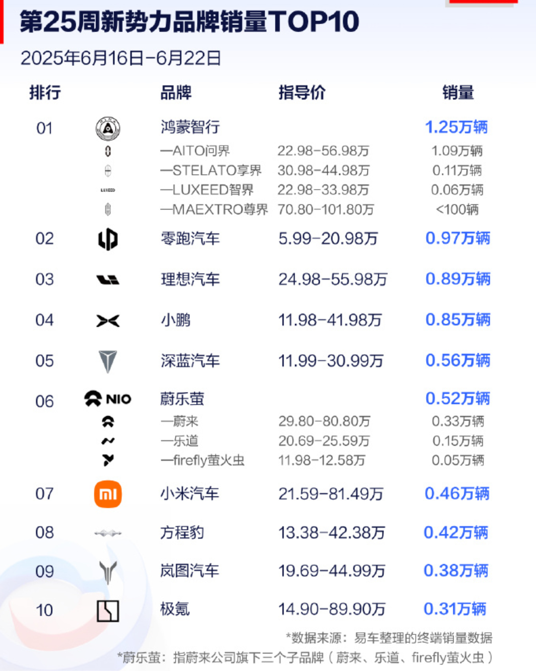 6月24日周二,随着各大汽车厂商对外公布周销量,一份由易车发布的“新势力周销量榜单”出炉,统计时间为2025年6月16日-2025年6月22日,也就是2025年第25周。