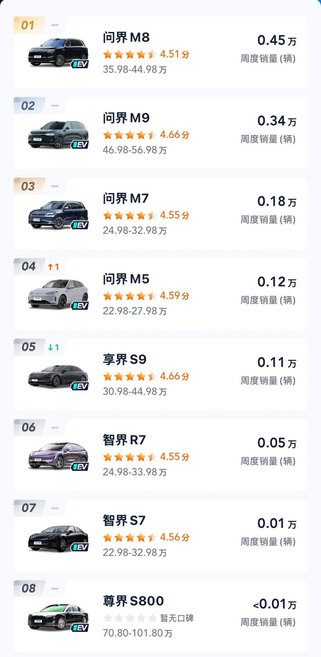 从统计的榜单来看,鸿蒙智行(问界、智界、享界、尊界)以1.25万辆位居榜单,超过零跑汽车和理想汽车,其中主要销量来自问界,问界单周销量为1.09万辆,按照单一品牌计算的话,问界同样是新势力销量第一品牌,目前问界在售车型包括M5、M7、M8、M9四款,其中问界M8为0.45万辆,问界M9为0.34万辆,而问界M7仅有0.18我哪里,在问界M8上市后,更多的消费者选择了问界M7,导致问界M7销售遇冷。另外,问界M5也延续销量低迷,仅0.12万辆。鸿蒙智行其它品牌表现相对一般,其中享界为0.11万辆,智界为0.06万辆,尊界在200辆以下。